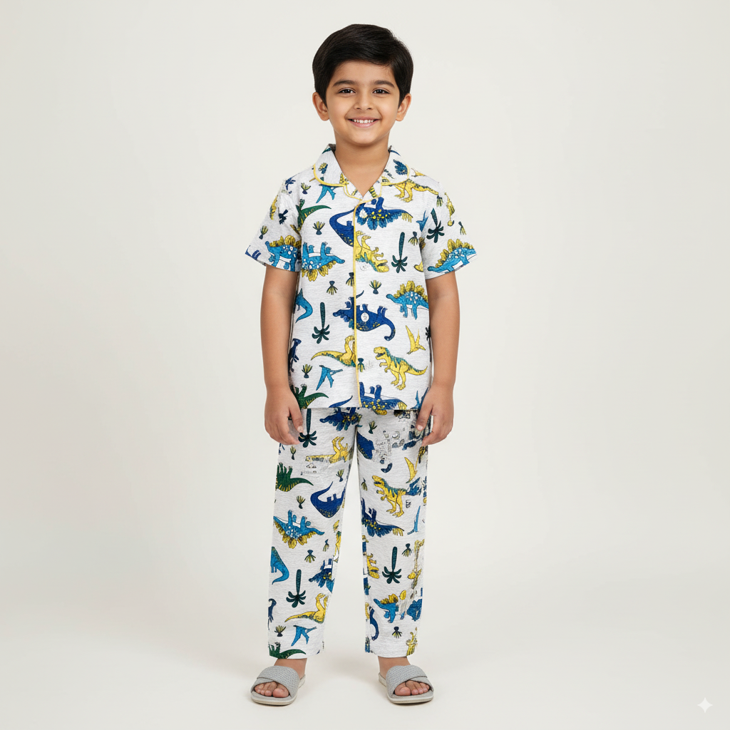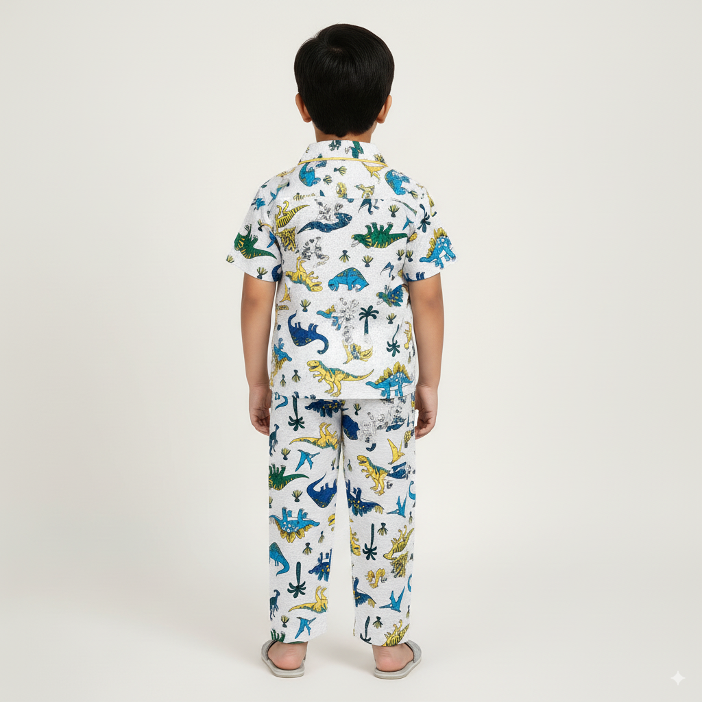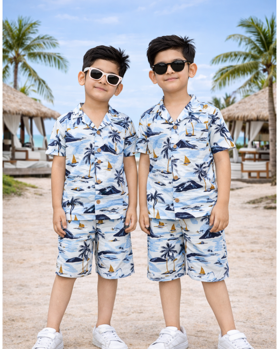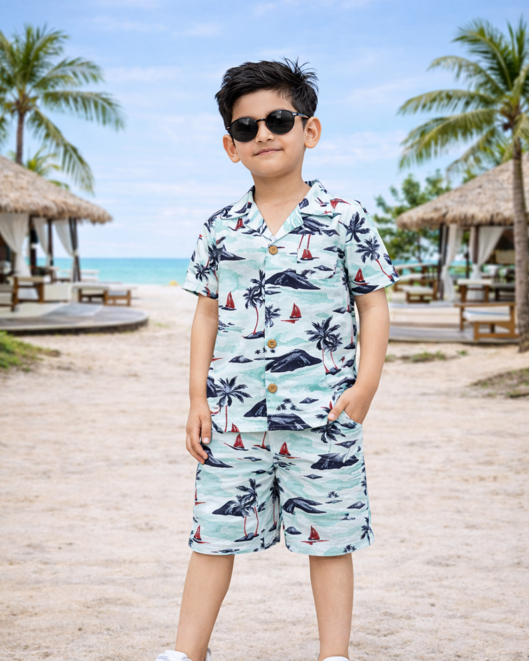 Tropical Hut Tree Boys Printed Half Sleeve Shirt with Shorts | Cuban Collar Shirt & Short Set