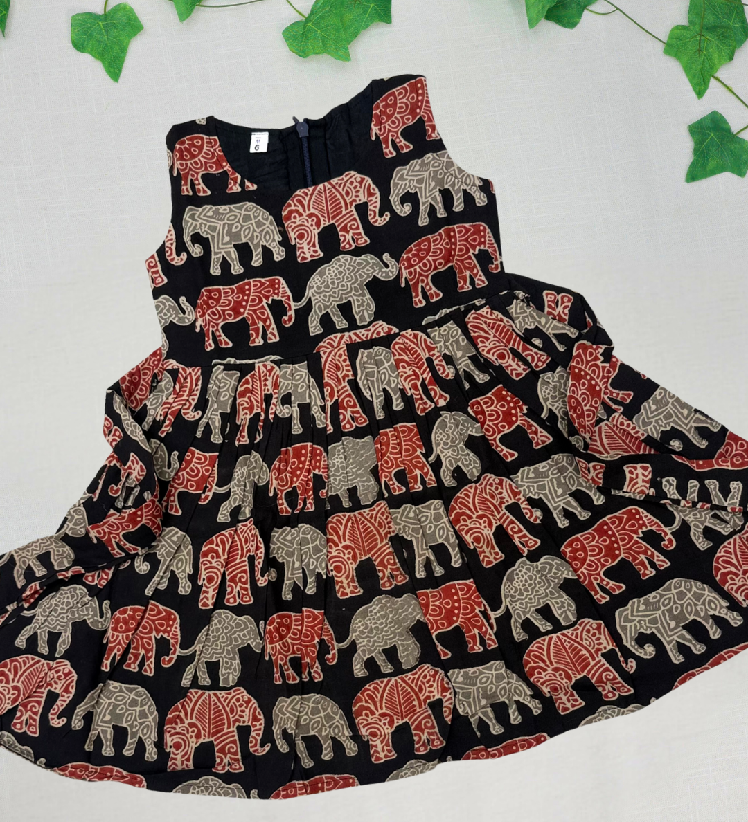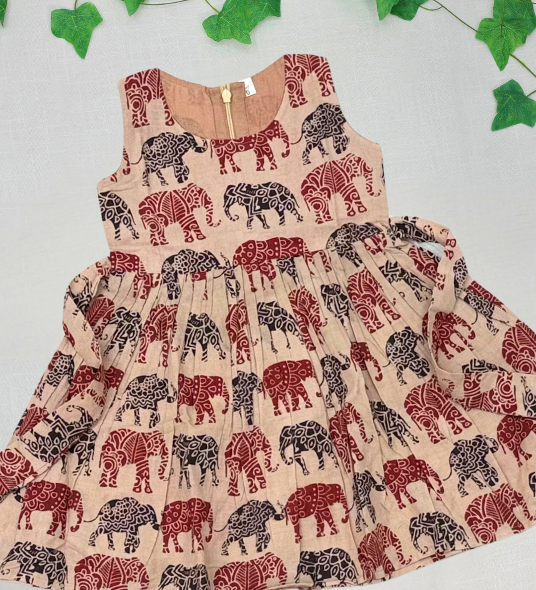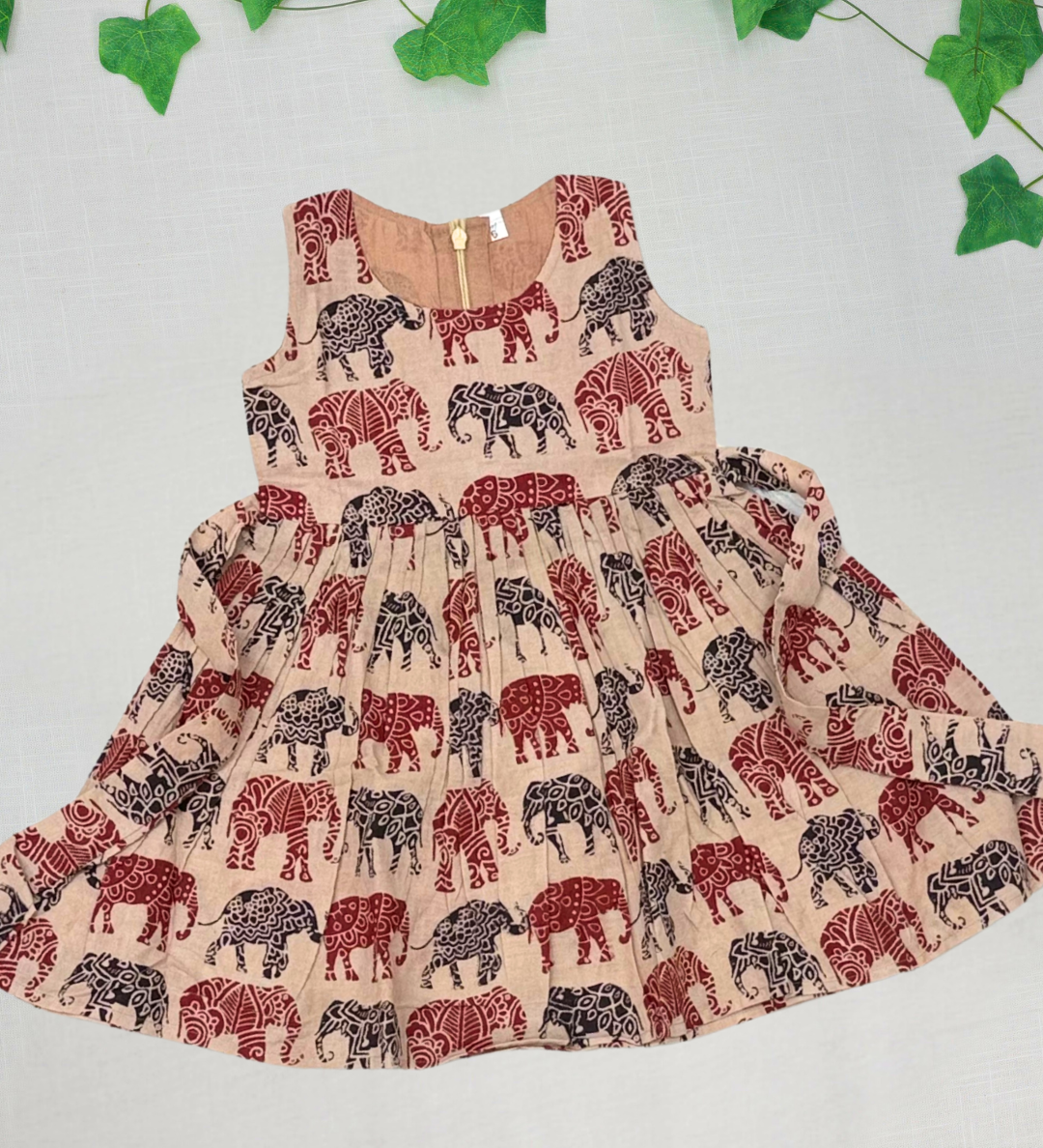 Kalamkari BG Elephant Print Cotton Frock | Sleeves Frock Calf Length