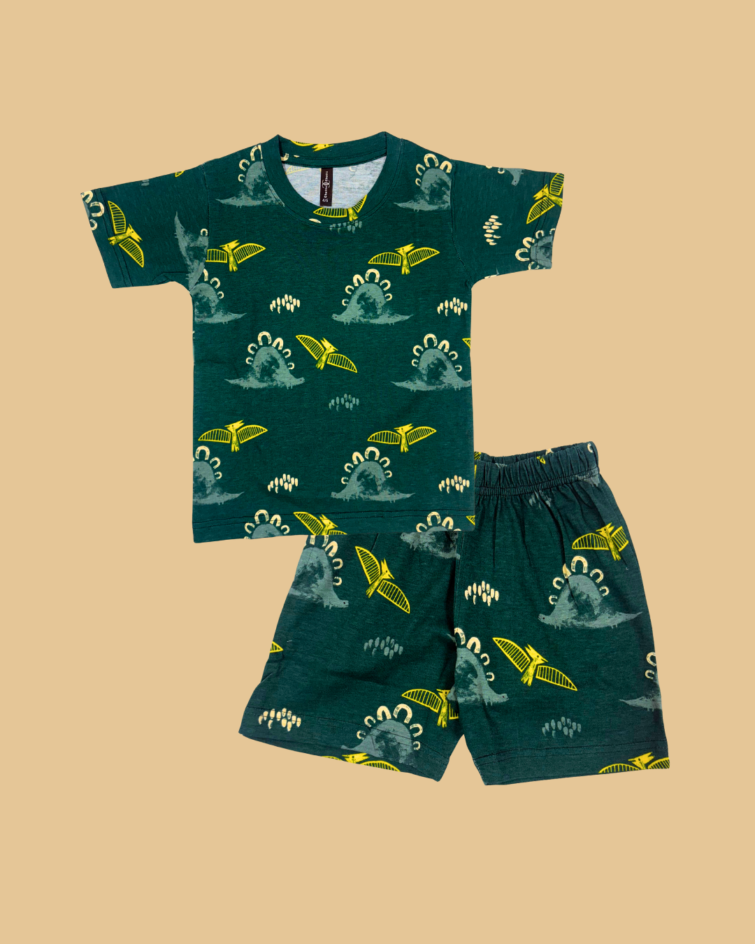 Green Dino Print Kids Shorts Coord Set (Unisex) - Shorts with Single Side Packet