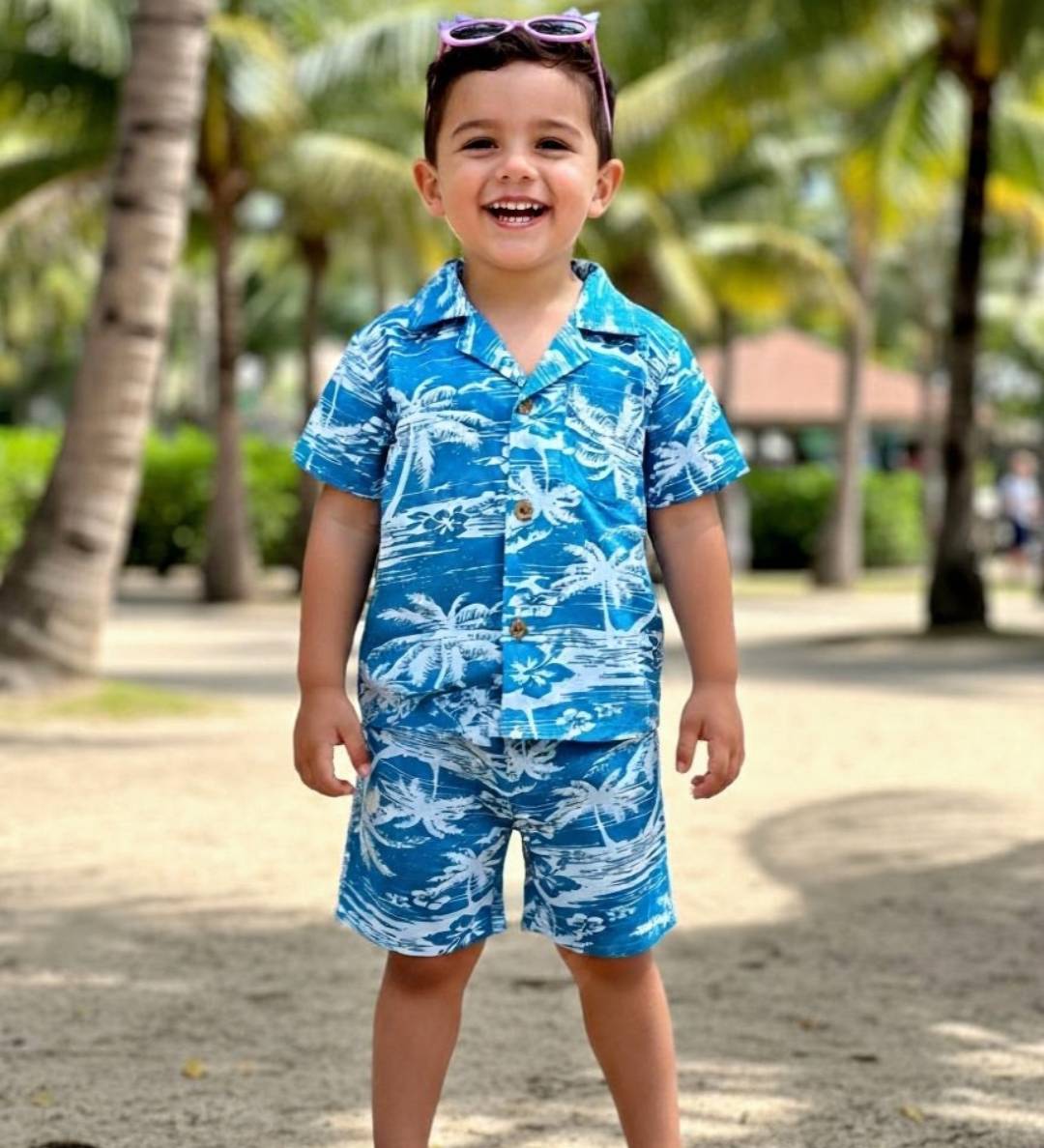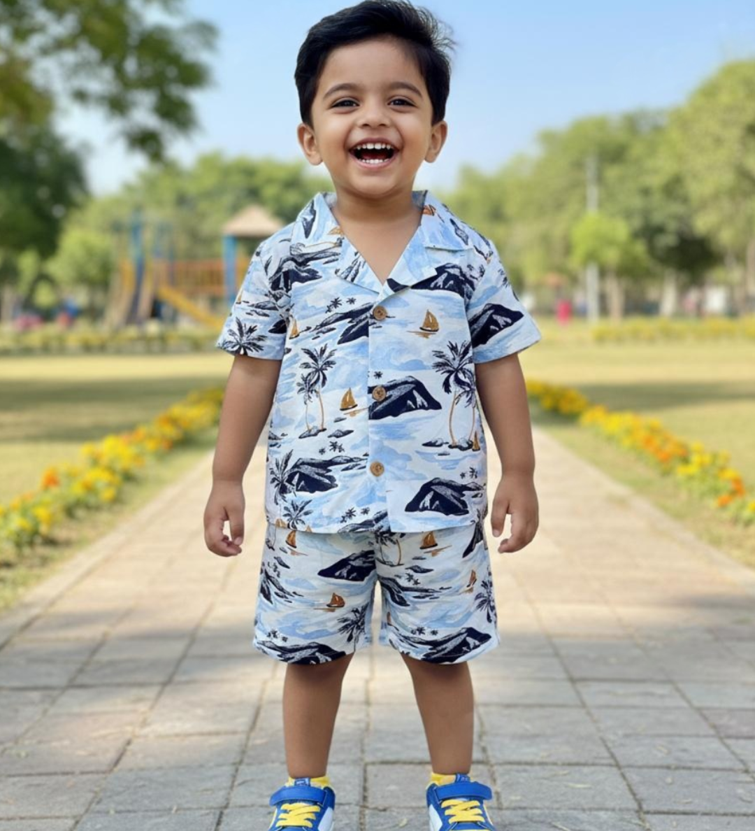 Tropical Blue Sea Boys Printed Half Sleeve Shirt with Shorts | Cuban Collar Shirt & Shorts Set