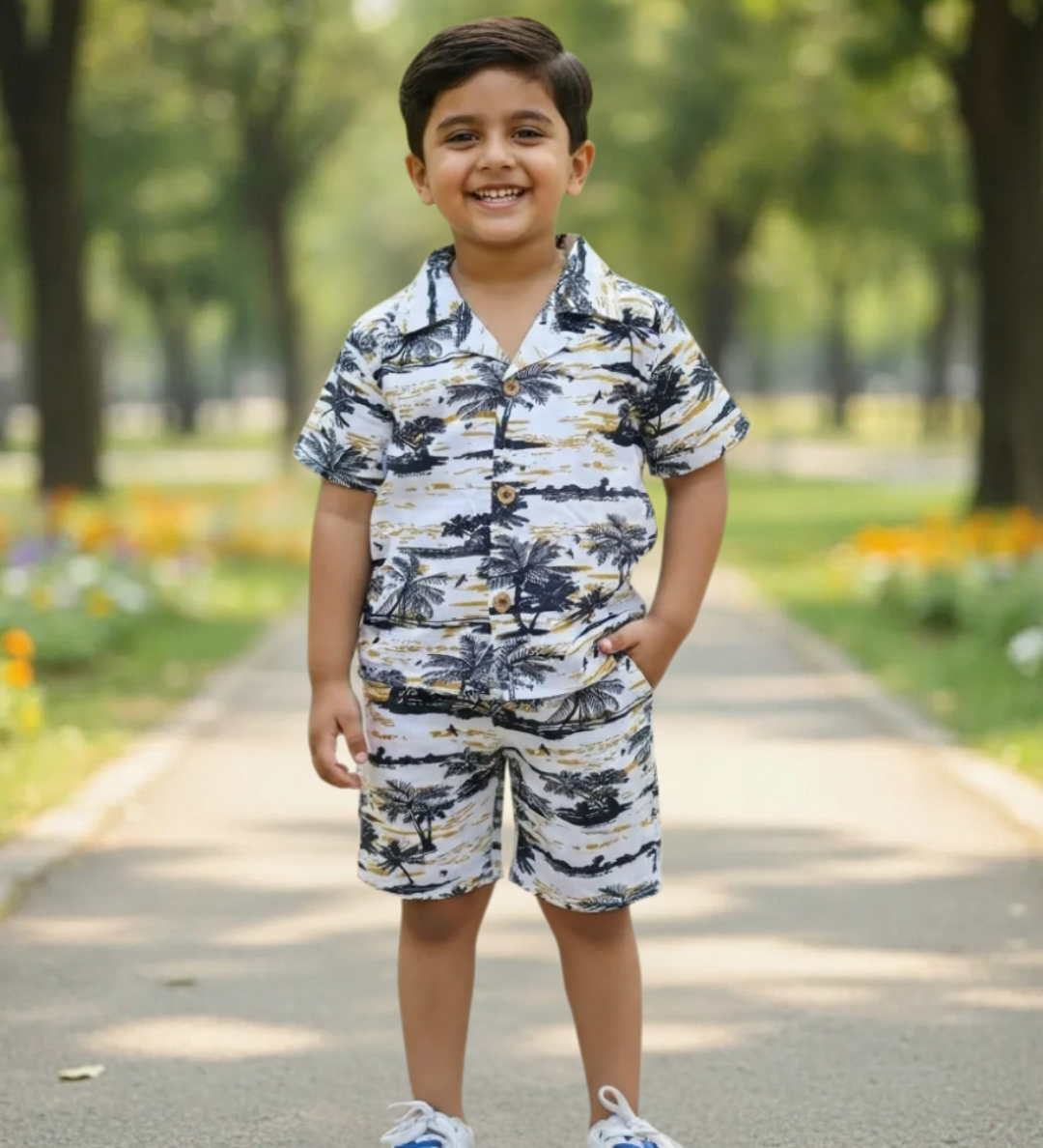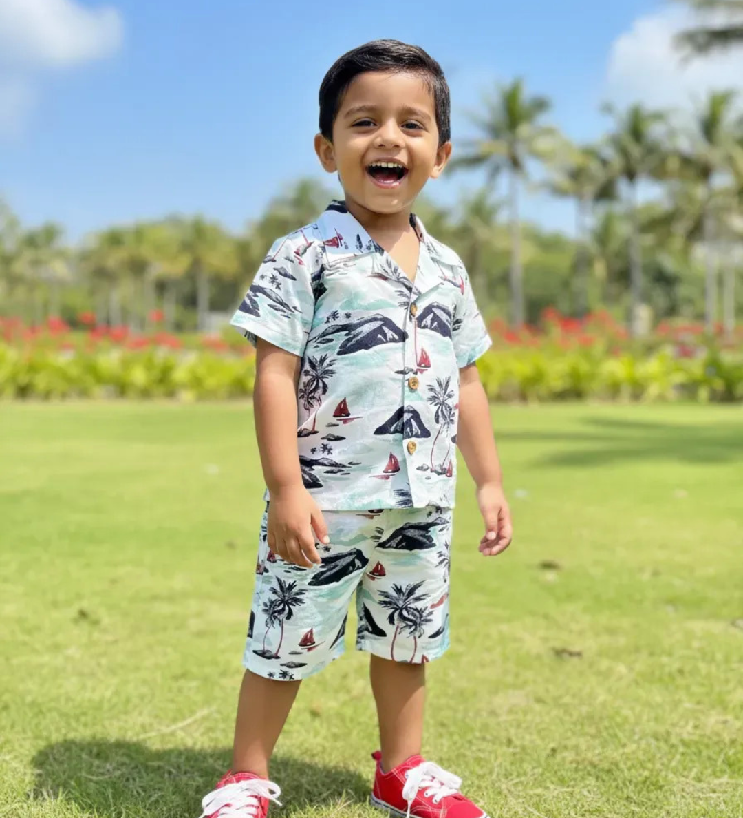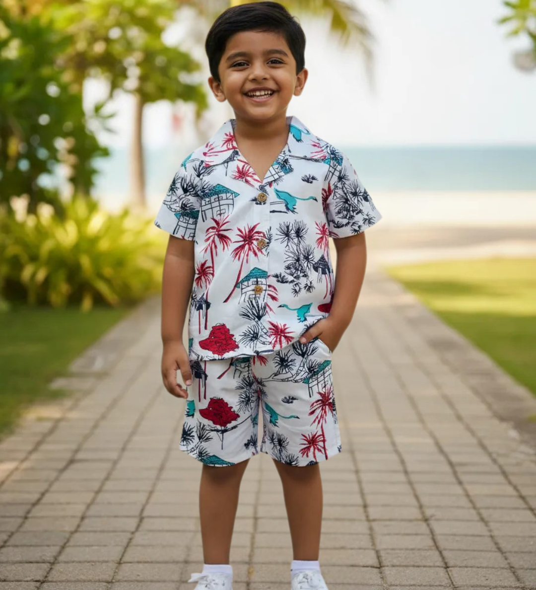 Tropical Hut Tree Boys Printed Half Sleeve Shirt with Shorts | Cuban Collar Shirt & Short Set