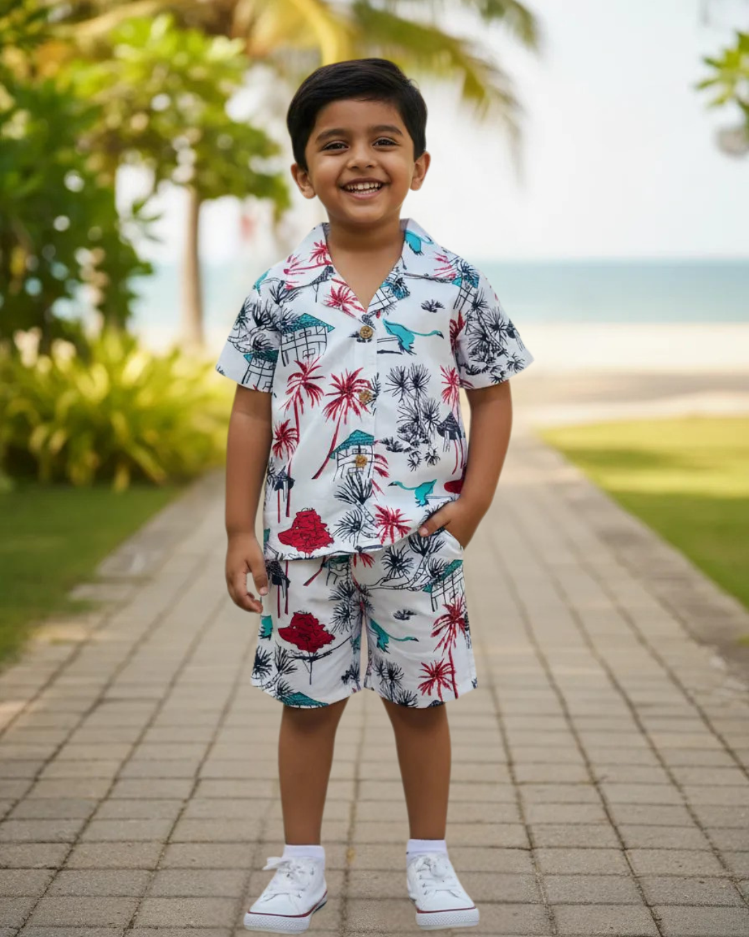Tropical Hut Tree Boys Printed Half Sleeve Shirt with Shorts | Cuban Collar Shirt & Short Set