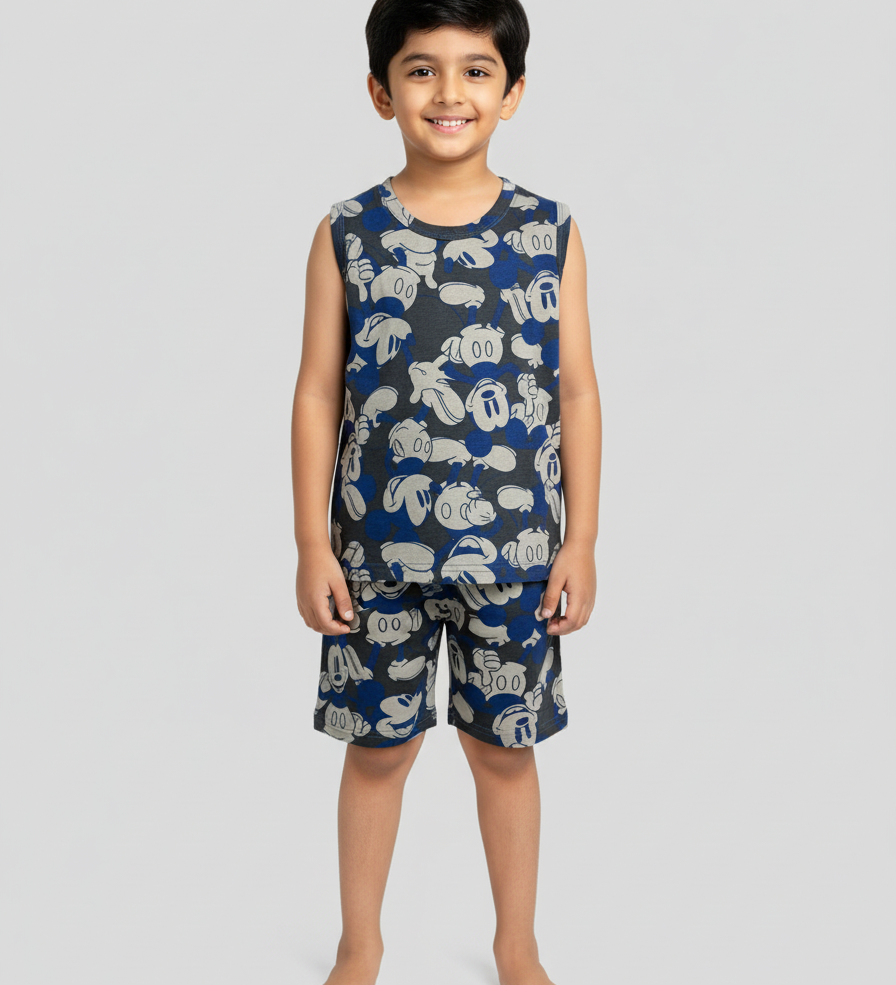 Blue Mickey Print Kids Sleeveless T-Shirt Shorts Set (Unisex)