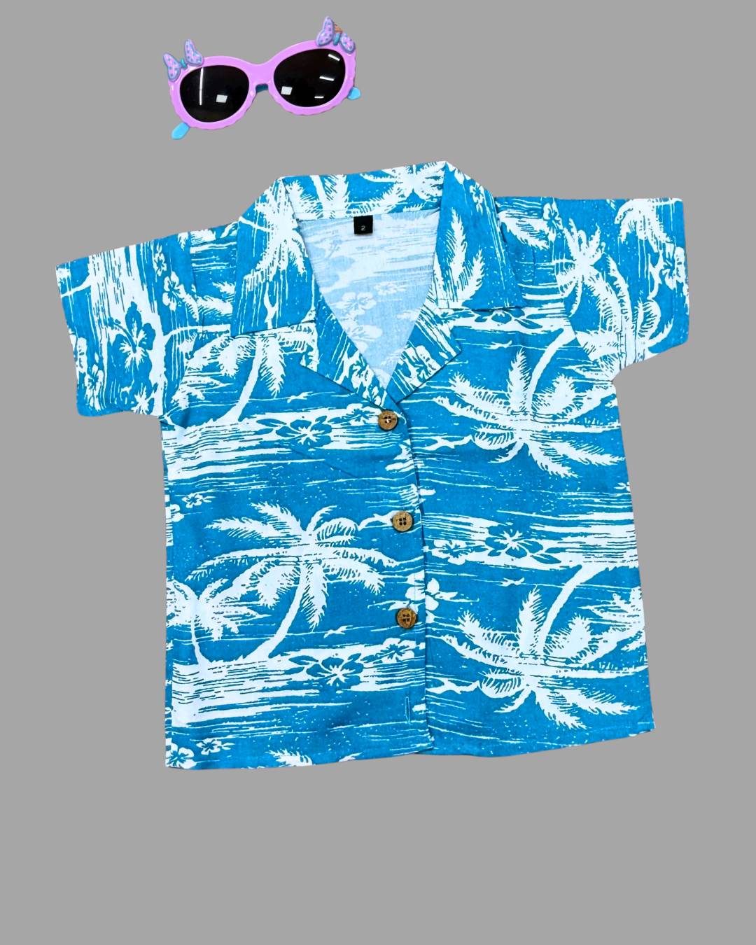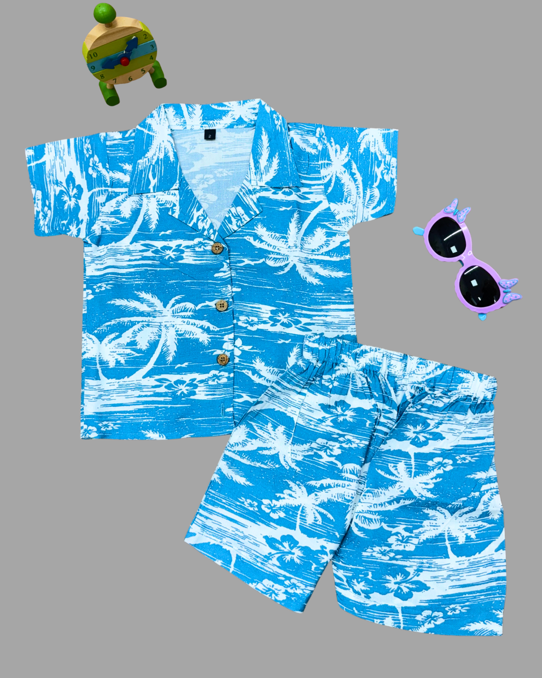 Tropical Blue Seashore Boys Printed Half Sleeve Shirt with Shorts | Cuban Collar Shirt & Shorts Set