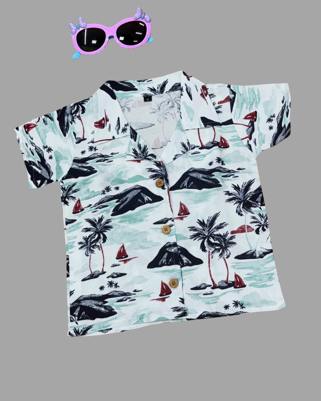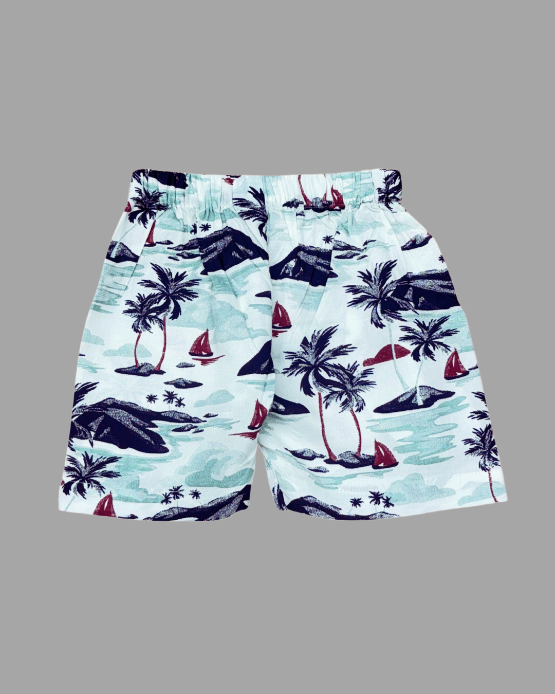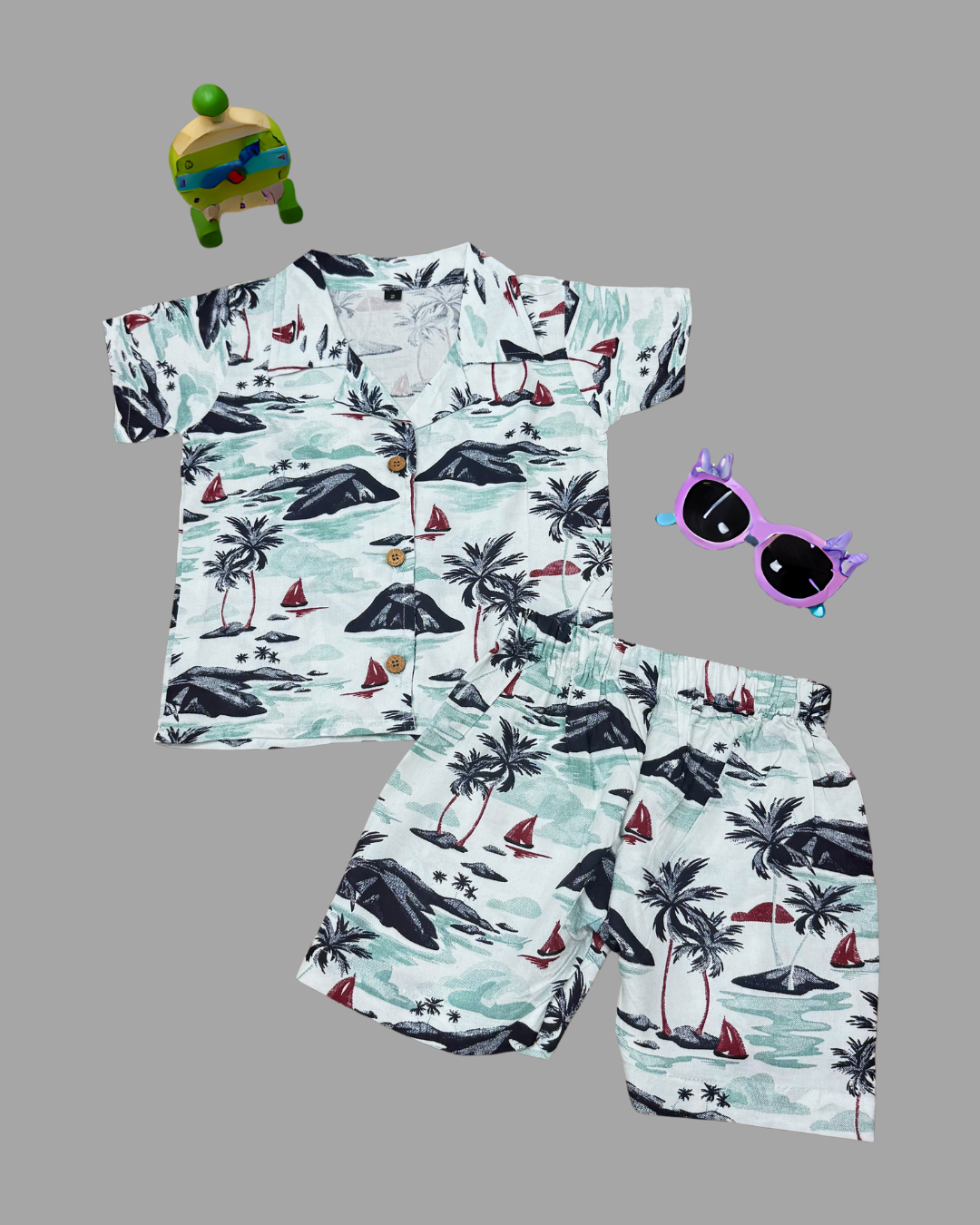 Tropical Green Sea Boys Printed Half Sleeve Shirt with Shorts | Cuban Collar Shirt & Shorts Set