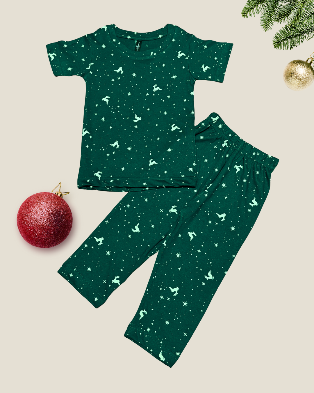 Christmas Green Unicorn Print Kids Coords (Unisex) - Half Sleeve T-Shirt and Full Pant