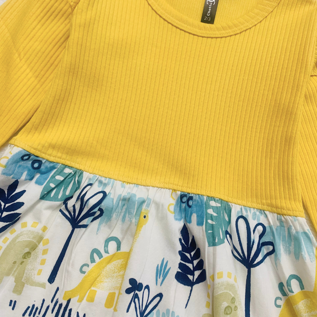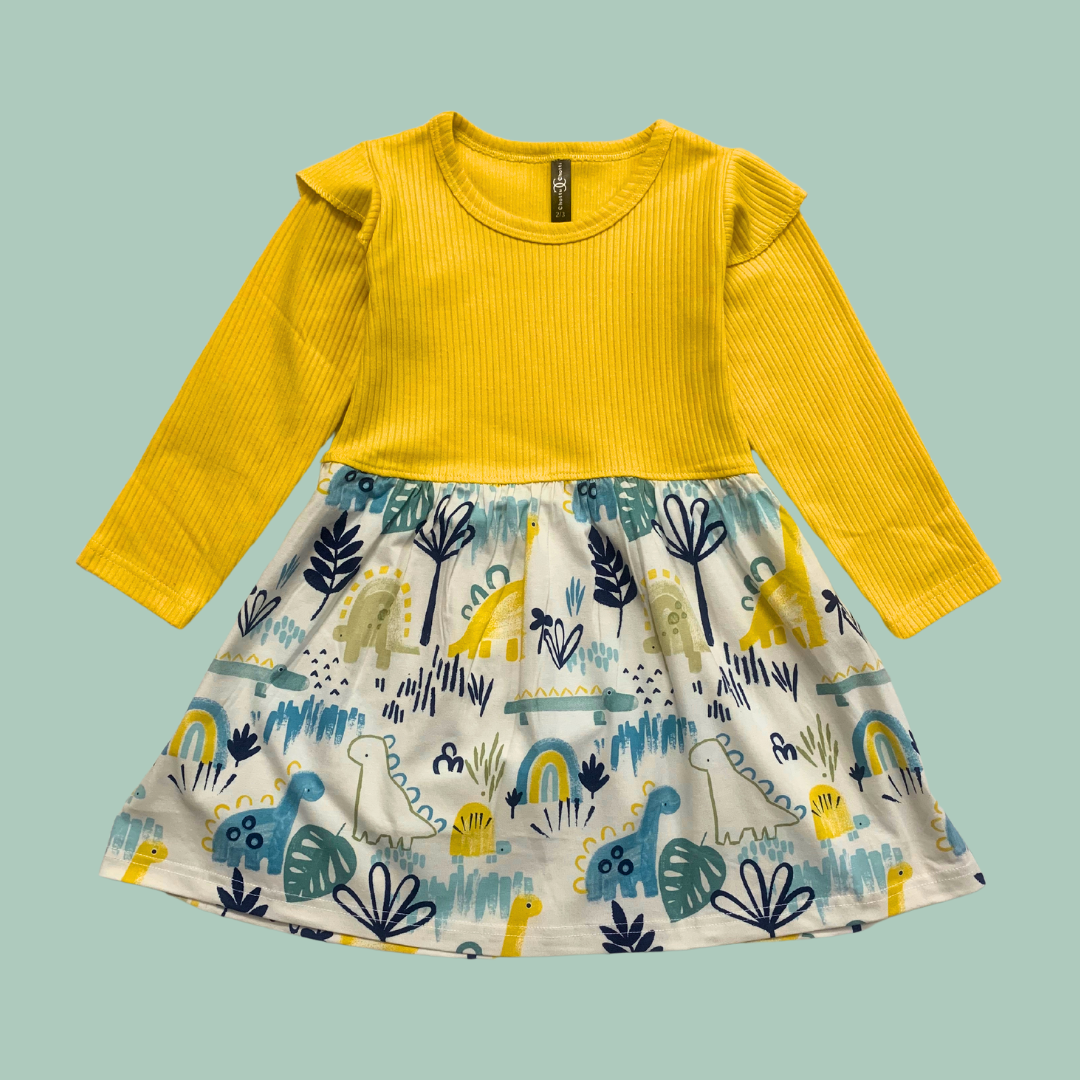 Full Sleeves Girls Frock - Yellow & Dino Print | Knee Length