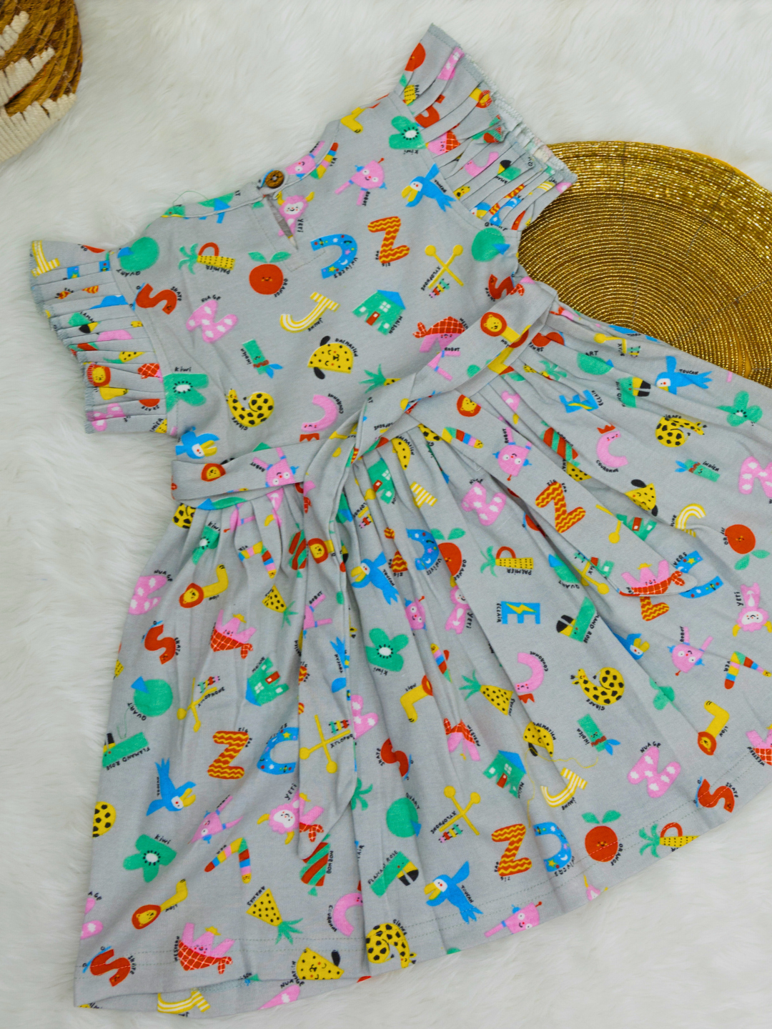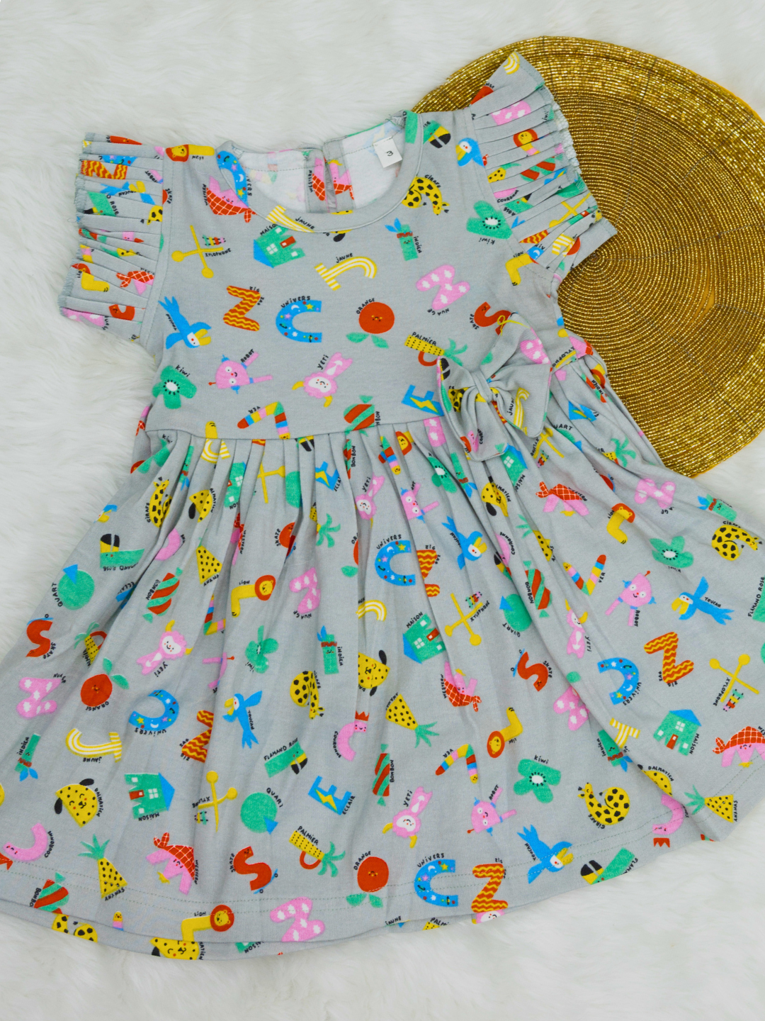 Grey Alpha cub - Frill Cotton Frock with Ruffle Sleeve and bow