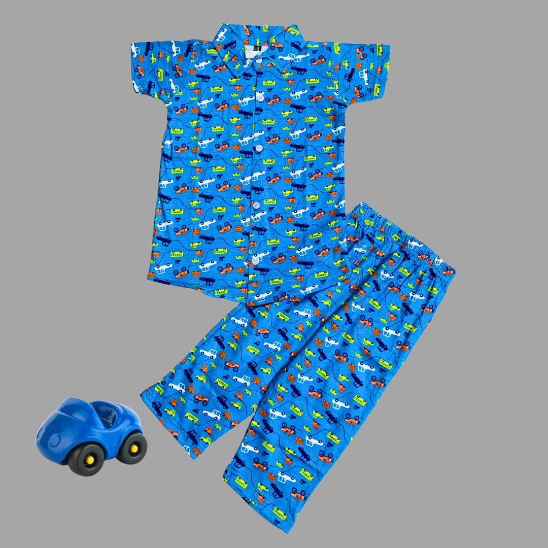 Blue Cars Print Kids collar Coord Set - Half Sleeve Shirt and Full Pant