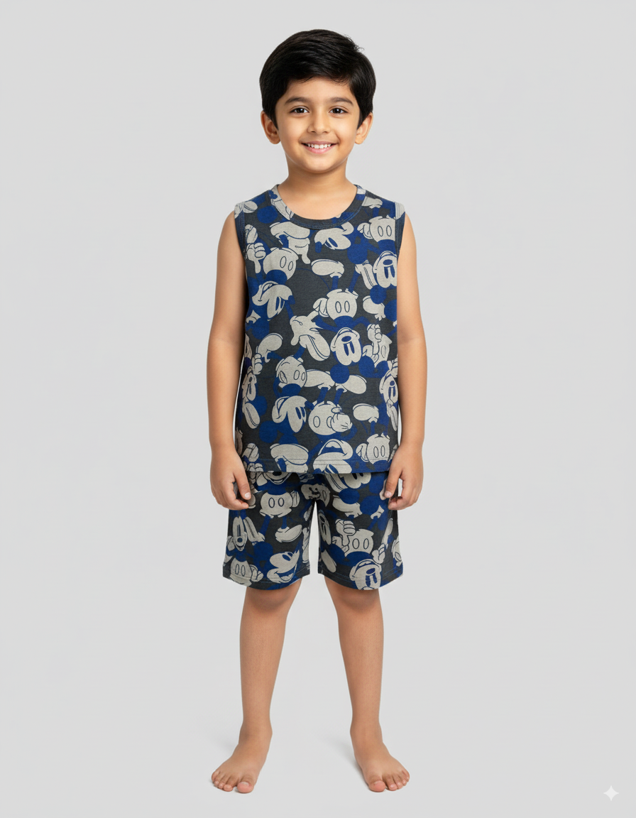 Blue Mickey Print Kids Sleeveless T-Shirt Shorts Set (Unisex)
