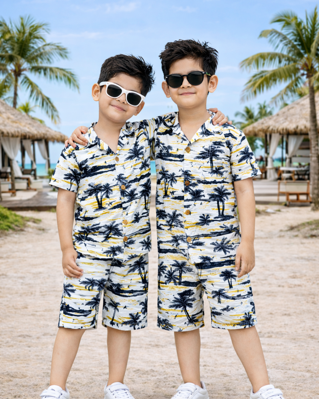 Tropical Sunset Seashore Boys Printed Half Sleeve Shirt with Shorts | Cuban Collar Shirt & Shorts Set