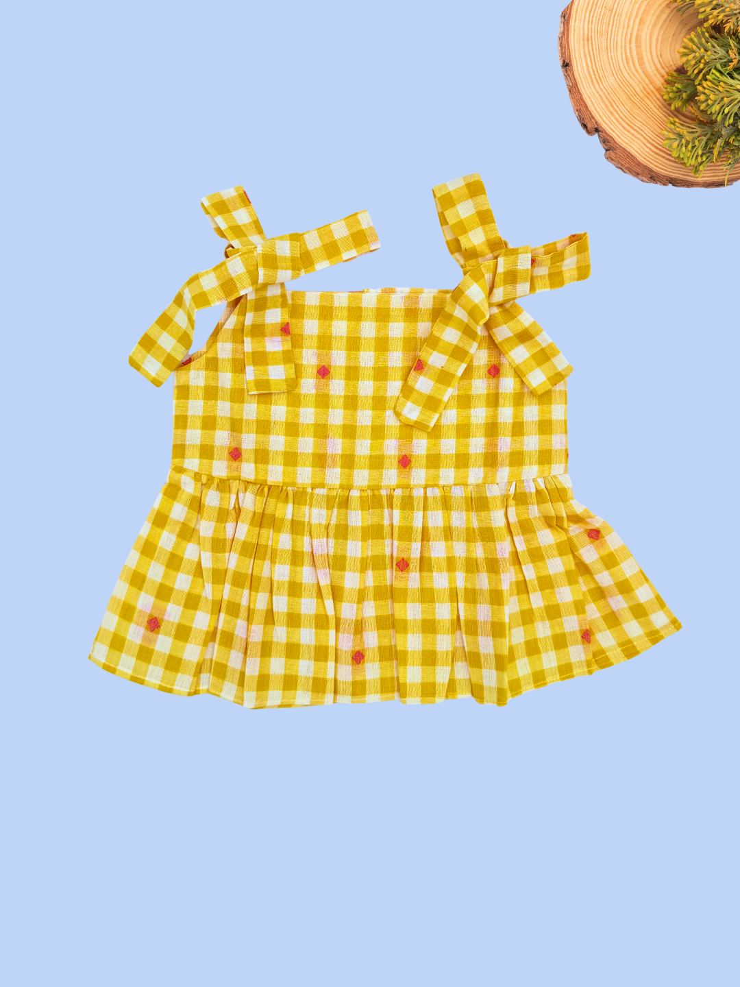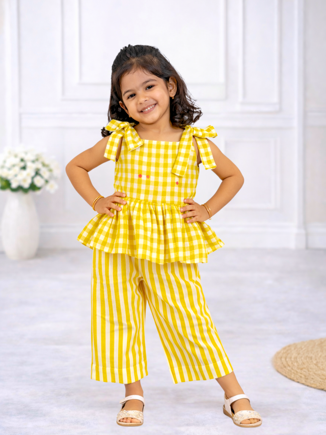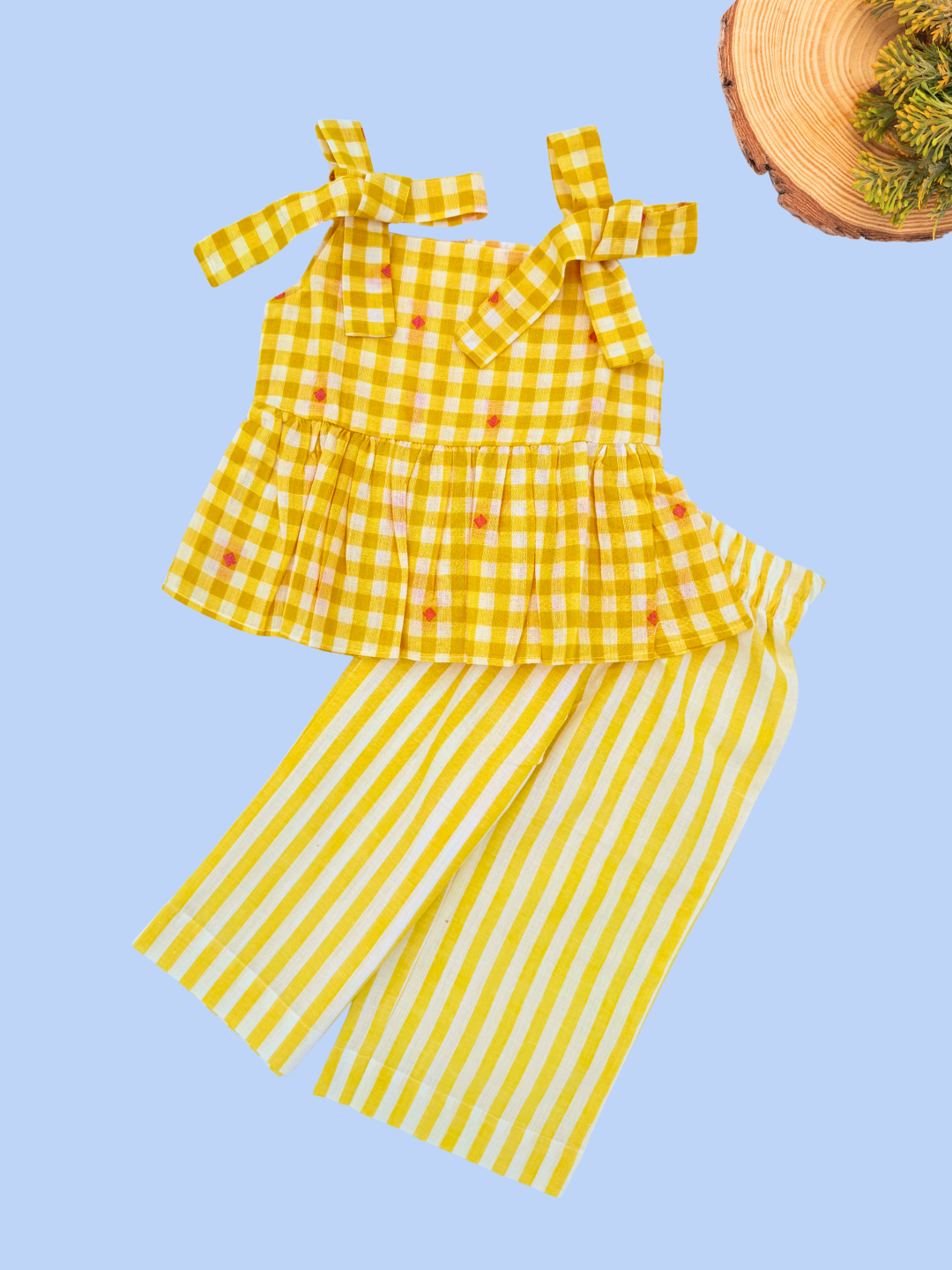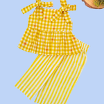 Yellow Checks Sleeveless Co-ord Set - Sleeveless top with shoulder knot