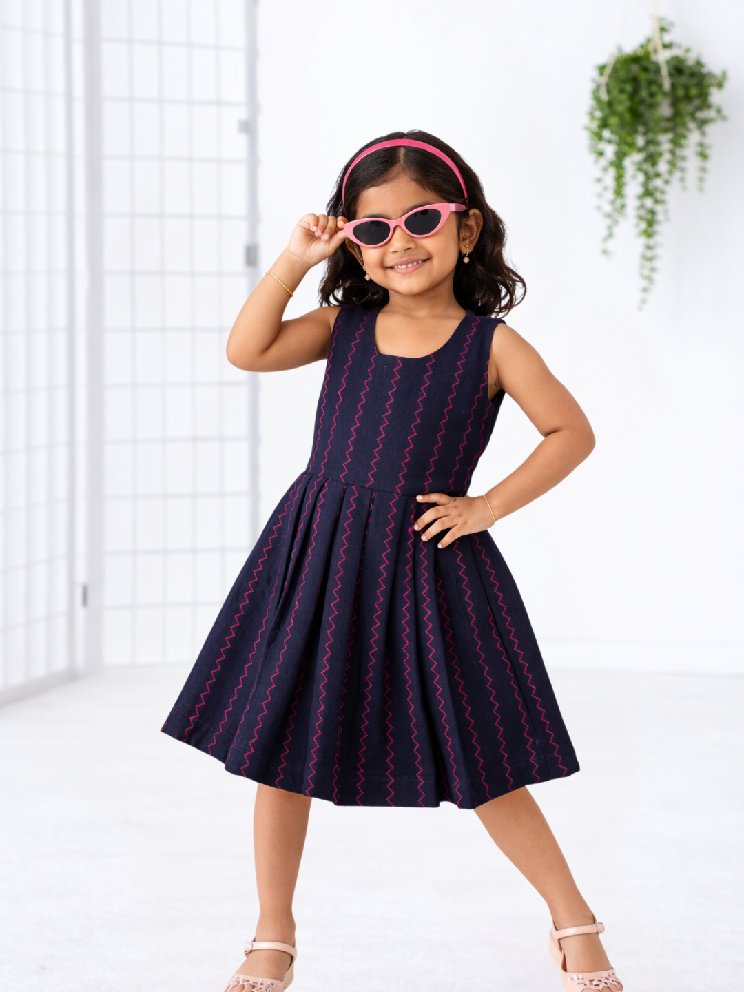 The sleeveless bodice offers a neat, structured fit, while the pleated skirt creates a graceful, flowy silhouette—perfect for twirls, playtime, and special occasions. Made from soft, breathable cotton and fully lined, it ensures all-day comfort for your child.