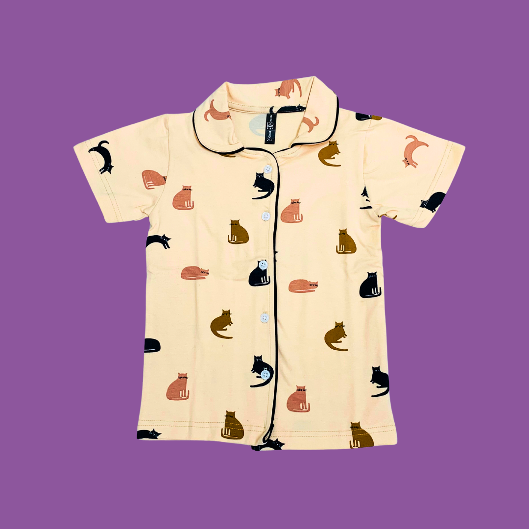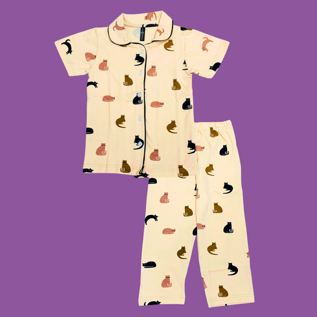 Meow Print Kids Night Suit - Half Sleeve Shirt and Full Pant