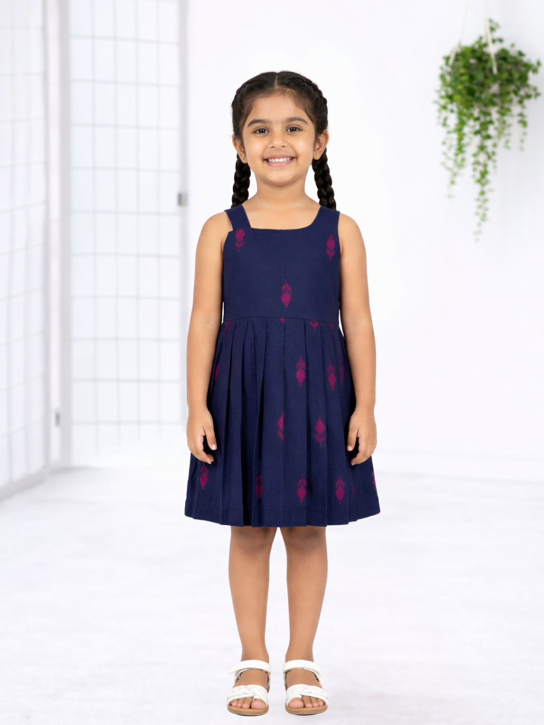 Designed with a structured bodice and soft pleated skirt, it offers a graceful silhouette while allowing free movement for play and twirls. The breathable cotton fabric keeps your child comfortable all day long, making it a wardrobe essential.