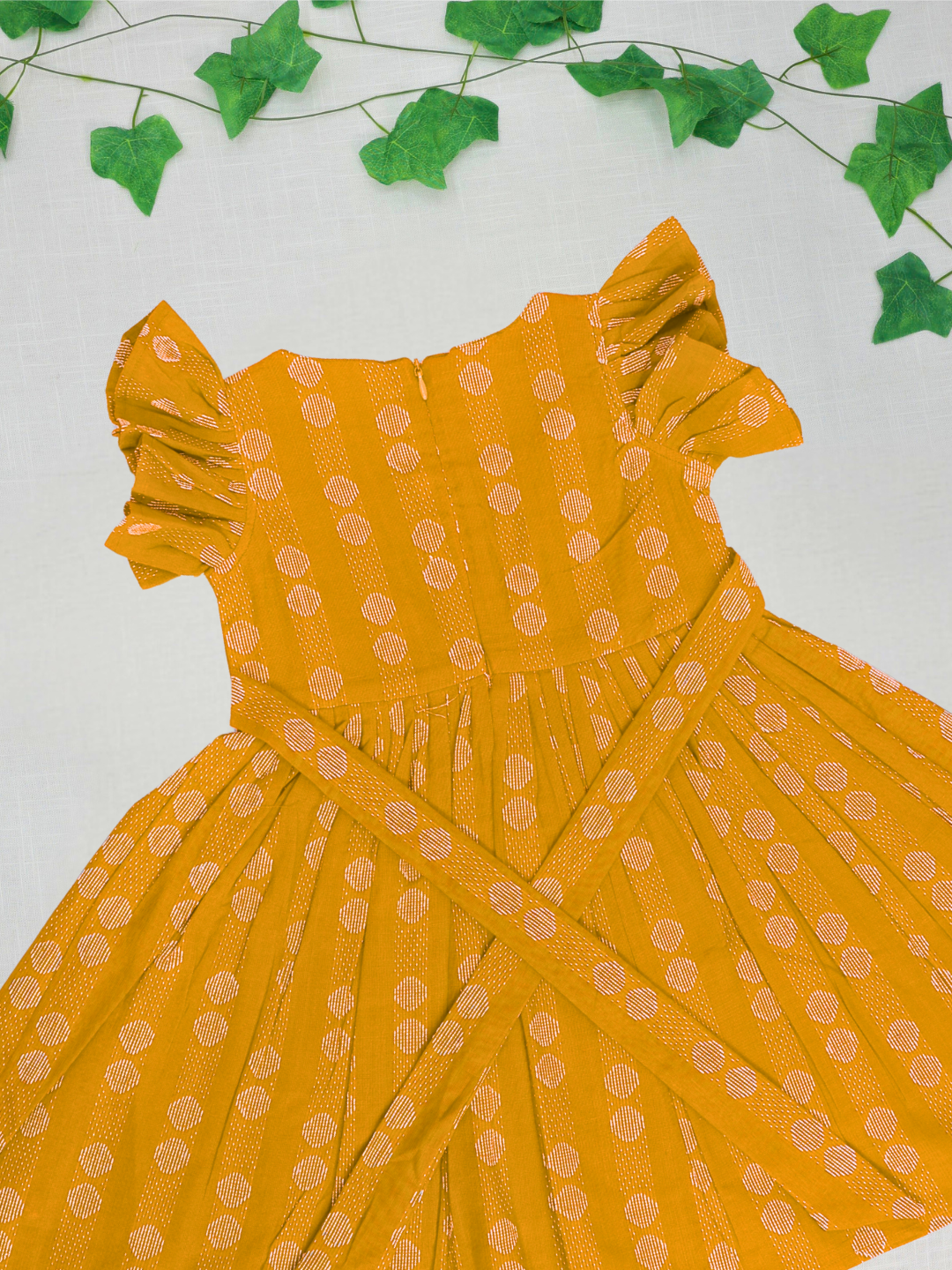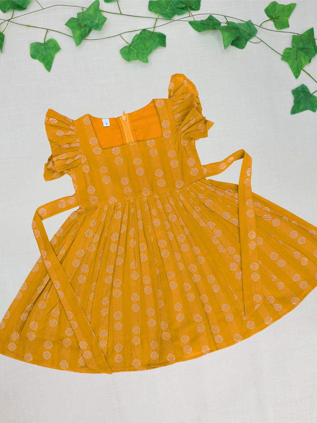 Crafted in handloom cotton with a soft cotton lining, this frock is designed to keep your kid stylish yet comfortable all day long. The bright magenta color and ruffle sleeves add a playful charm, while the back knot and zip closure give it an elegant finish.
