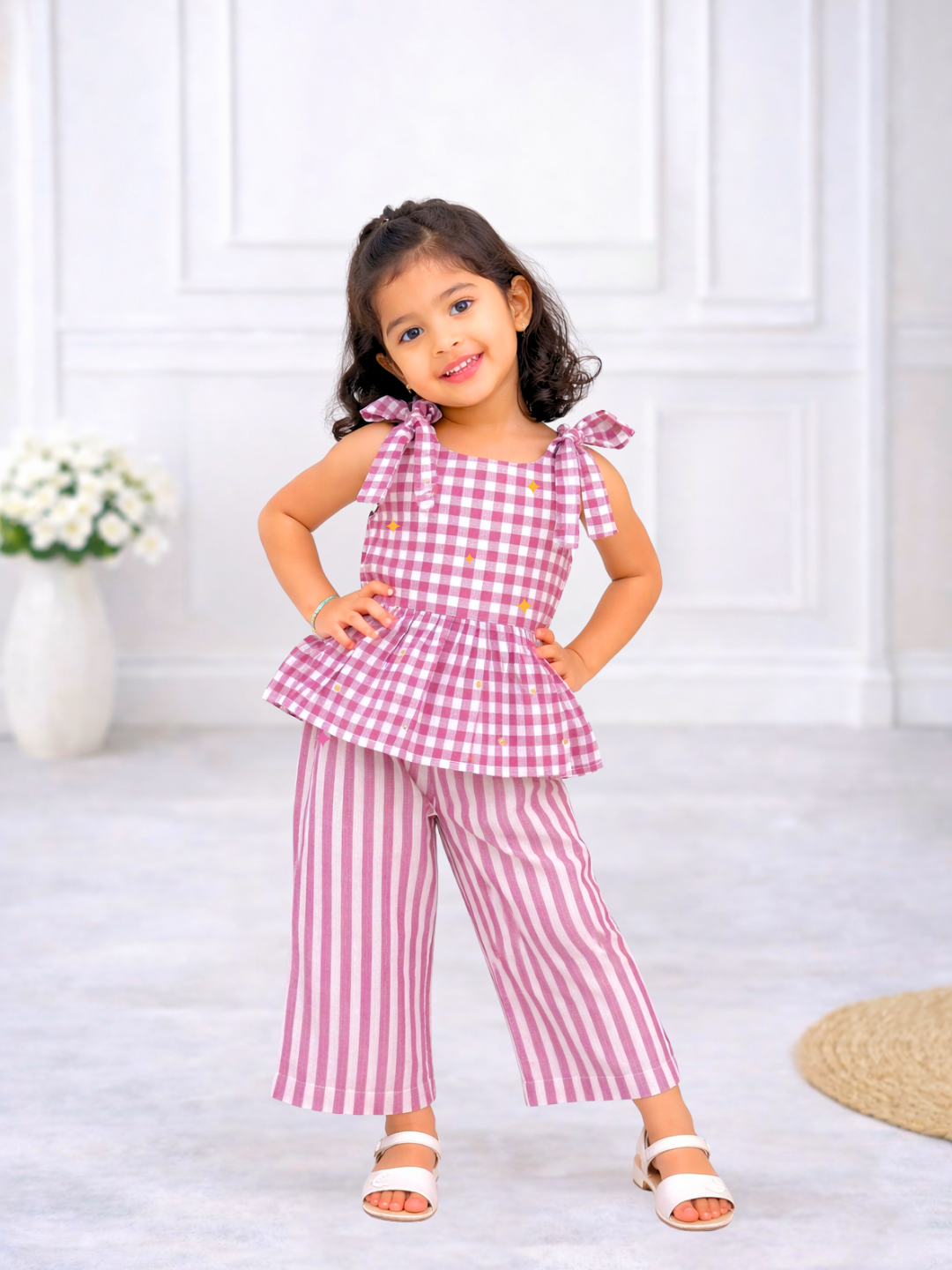 The sleeveless top features a trendy square neckline with cute shoulder knot detailing and a flared peplum-style hem, giving it a stylish yet breathable fit. Paired with comfortable matching striped pants with an elasticated waistband, this co-ord ensures ease of movement and all-day comfort.